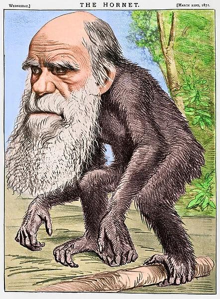 “Un venerable orangután: Una contribución a la historia antinatural” (caricatura de Charles Darwin publicada en la revista The Hornet el 22 de Marzo de 1871; colorizada).